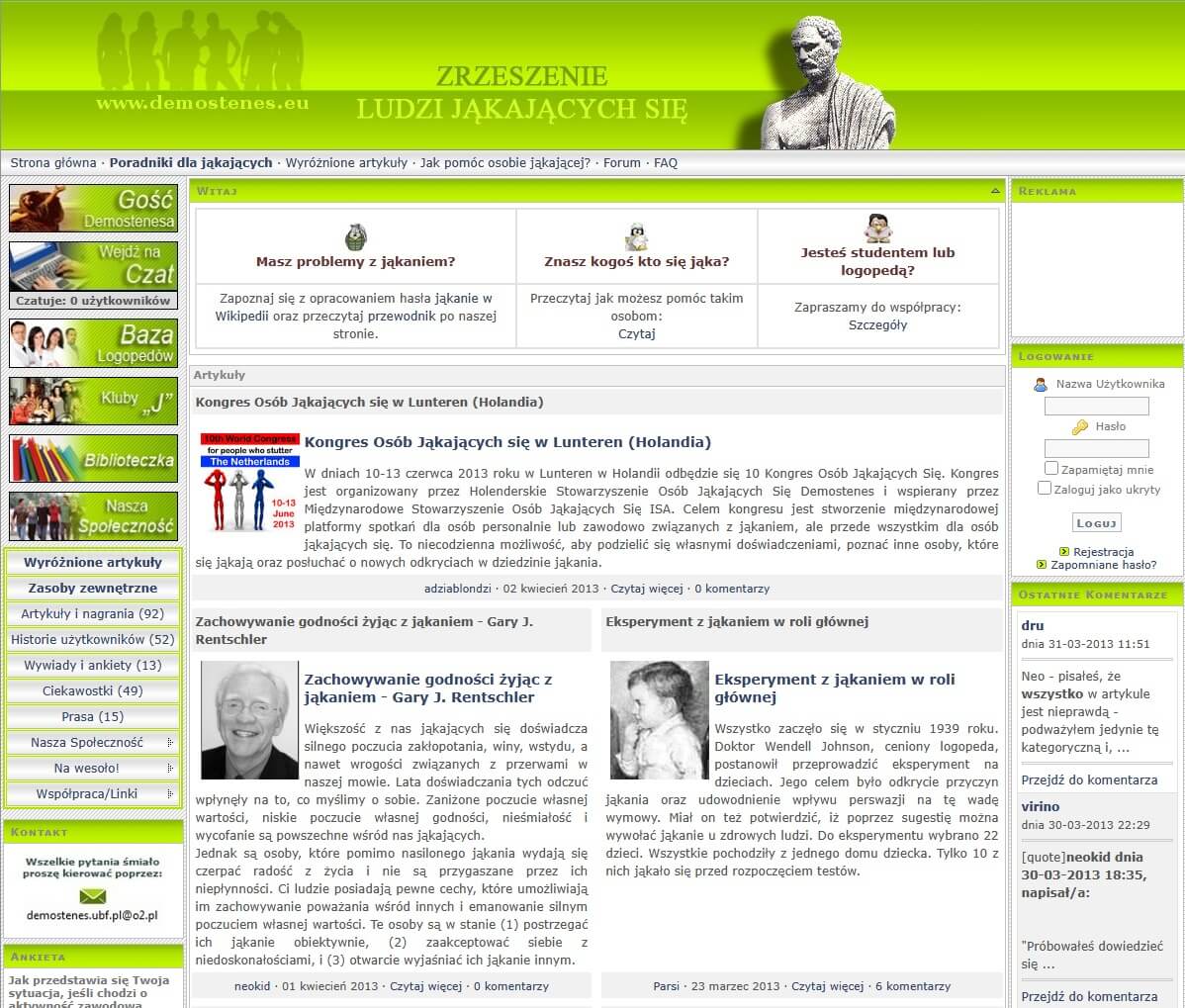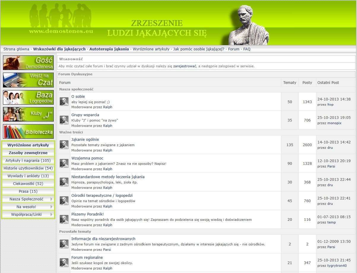 W 2009 roku nie było w polskim Internecie forum, gdzie można by swobodnie dyskutować na temat terapii jąkania i problemów jąkających. Jedyne ówczesne forum działało na stronie jednego z ośrodków terapeutycznych. Tę lukę zapełnił Demostenes. W serwisie powstało najpopularniejsze w Polsce forum o jąkaniu.